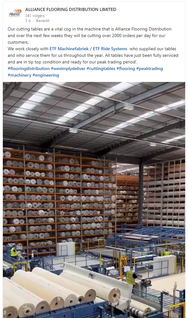 We are proud to share a LinkedIn post of our appreciated customer Alliance Flooring Distribution after a succesfull visit of our service engineers.